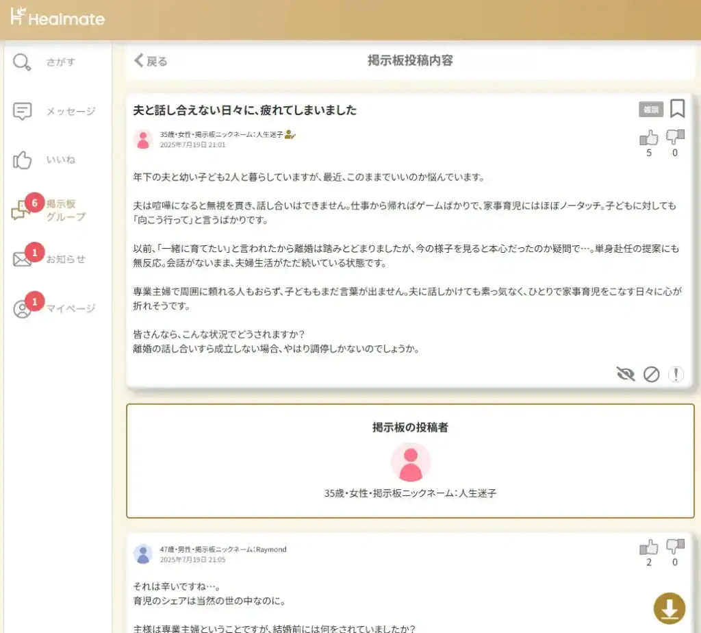既婚者マッチングアプリ「Healmate(ヒールメイト)」を運営するなかで、そんな苦しみを抱く既婚女性が非常に多いことを知りました。ヒールメイトの人気機能「掲示板」は、心の内を吐露する女性たちの声であふれています。そして、多くの女性たちが「同じ思いの仲間」が居ることを知り、勇気を得ているようです。